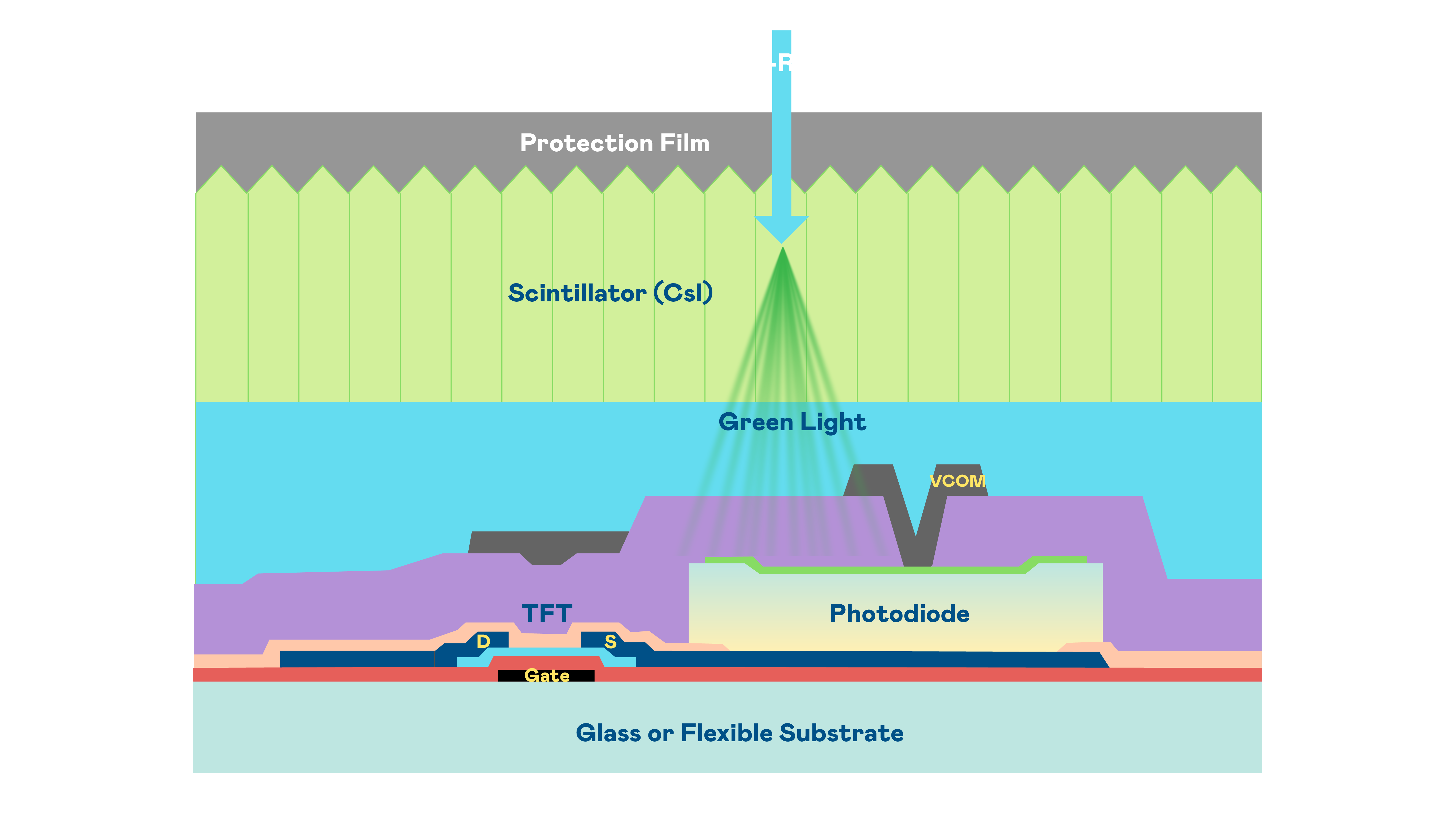 果冻传媒原创的X光影像感测阵列使用薄膜电晶体 (TFT) 作为每个像素的读取开关,搭配光电二极体(Photodiode)的光电转换元件,用以感测X光影像讯号。